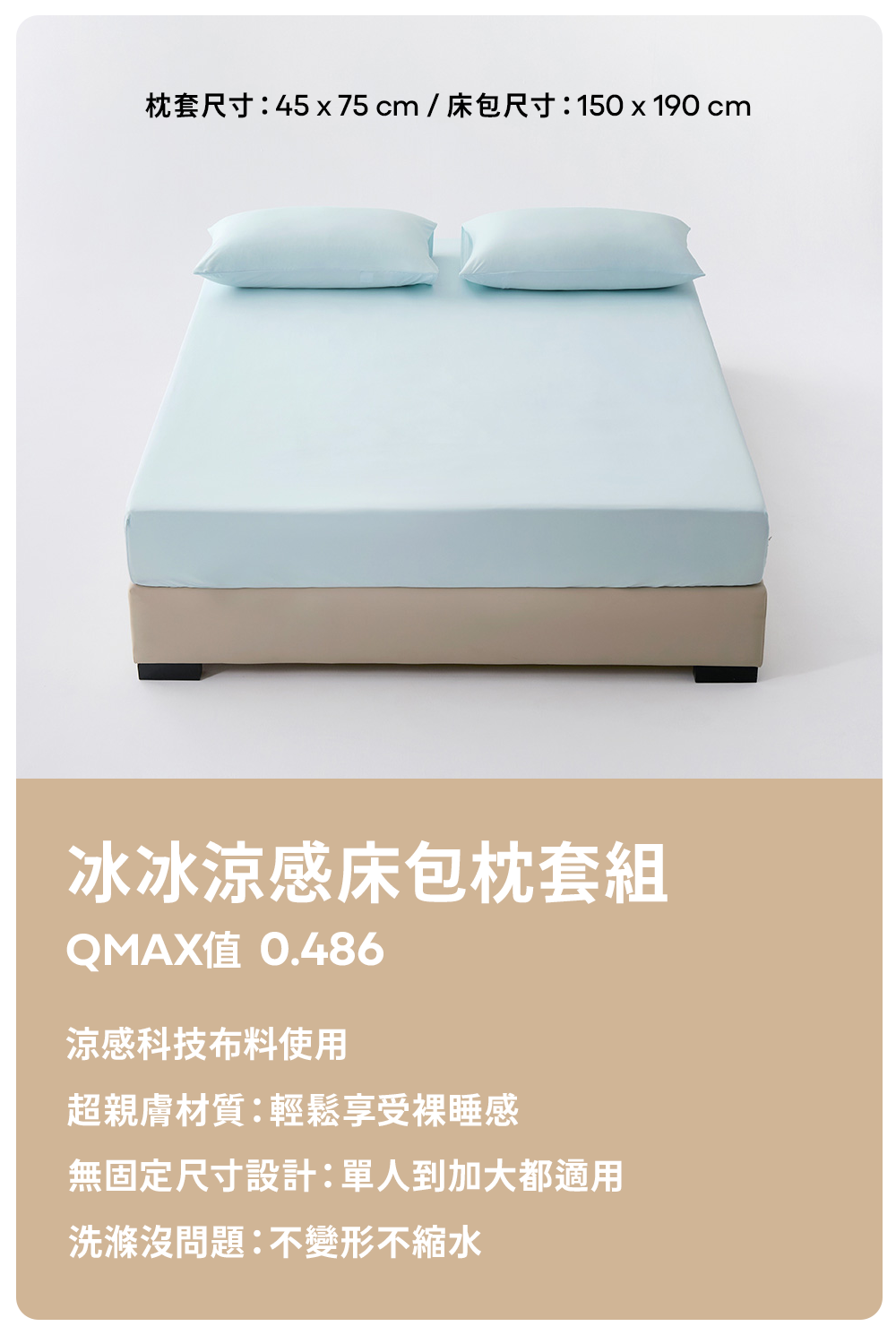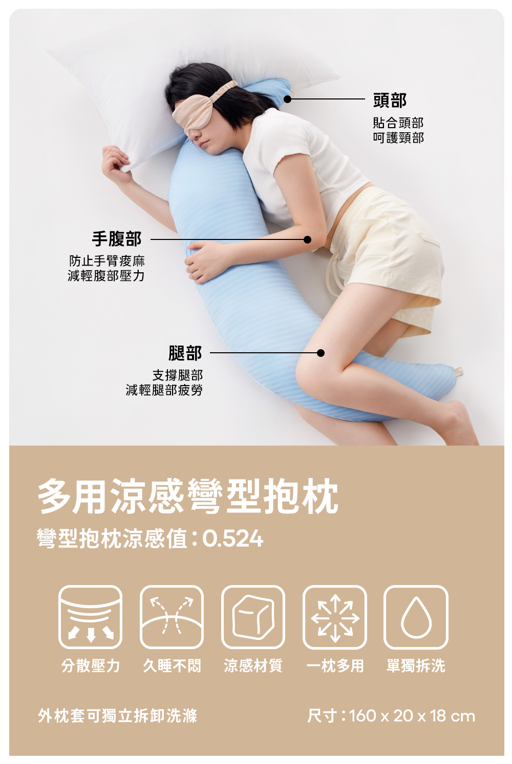 彎型抱枕*1+涼感床包*1+涼感枕套*2